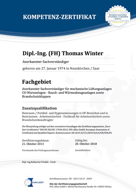 Anerkannter Sachverständiger für mechanische Lüftungsanlagen CO-Warnanlagen-Rauch-und Wärmeabzugsanlagen sowie Brandschutzklappen.